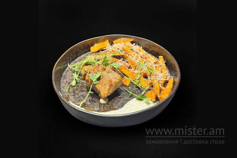 Медальони з яловичини з ароматним соусом та хрумким бататом