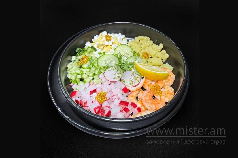 Окрошка з тигровими креветками (на айрані)
