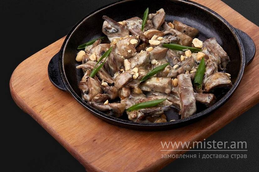 Язик, печериці, вершки, цибуля зелена, арахіс, зелень.