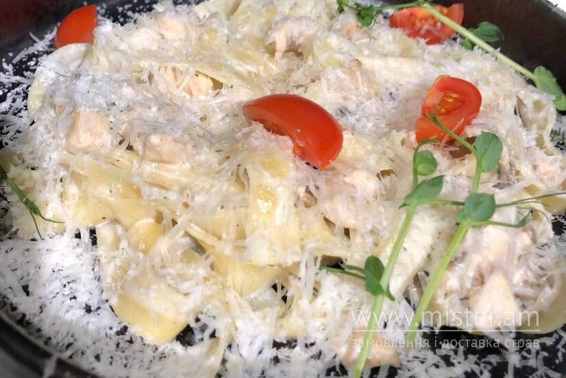 Паста фетучіні, печериці,куряче філе, вершки, часник, помідори чері, сир пармезан.