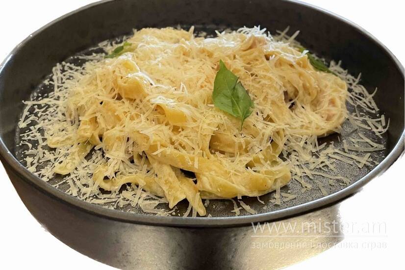 Паста фетучіні, лосось, вершки, сир пармезан, олія часникова, шпинат.