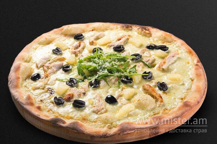 Моцарела, пармезан, куряча грудка, ананас, маслини, соус часниковий, соус томатний, рукола, олія часникова.