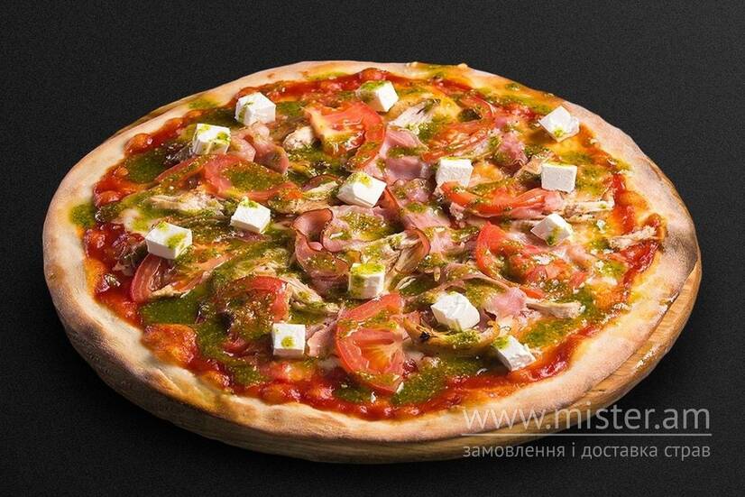 Сир фета, моцарела, куряча грудка, бекон, томати, рукола, соус песто, соус томатний, олія часникова.