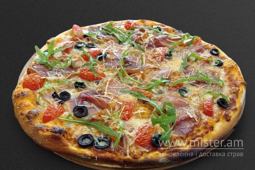 Хамон, руккола, соус томатний, помідори чері, маслини, сир моцарела, сир пармезан.