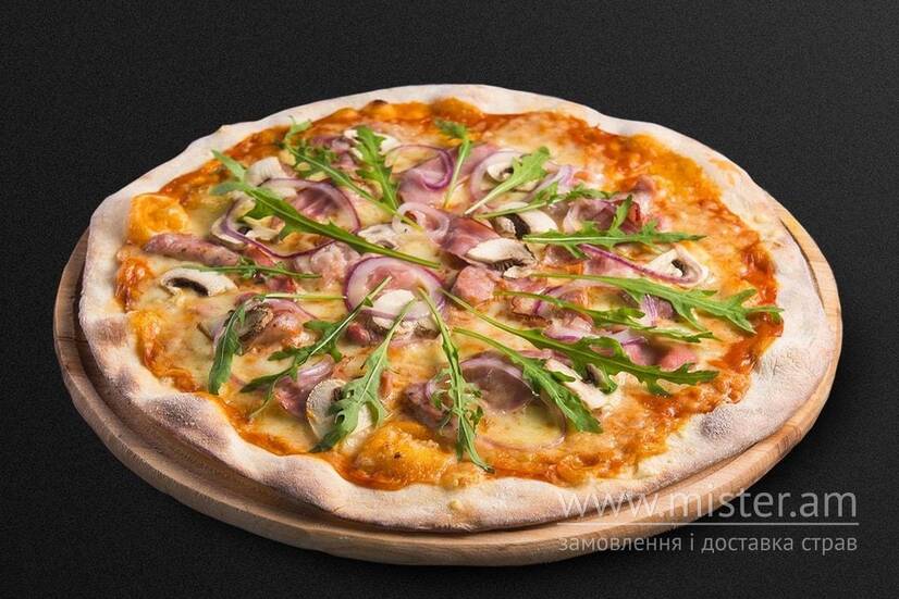 Моцарела, сир твердий, ковбаски, бекон, печериці, рукола, соус томатний, цибуля червона, олія часникова.