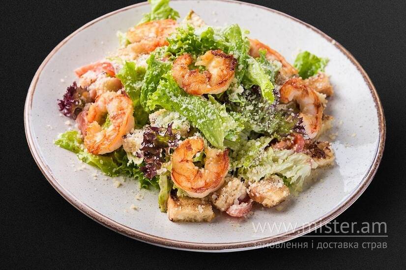 Соус Цезар, мікс салату, сухарі, креветки, помідори черрі, сир пармезан, лимон, часник.