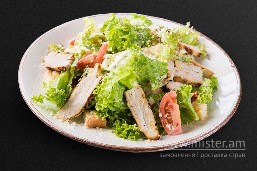 Соус Цезар, мікс салату, сухарі, куряче філе, помідори черрі, сир пармезан.