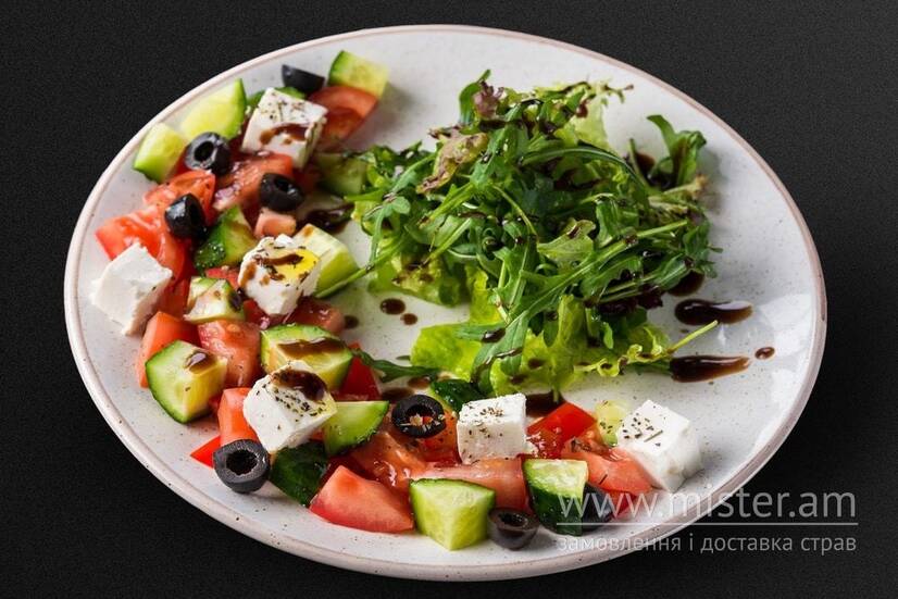 Мікс салату, огірки, помідори, перець болгарський, маслини, цибуля синя, сир "FETA", олія оливкова, рукола, крем бальзамік.