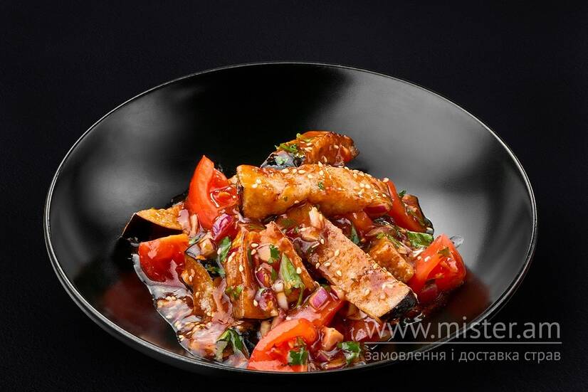 Смажений баклажан, помідор, зелень, устричний і солодкий тайський соус, червона цибуля, кунжут.