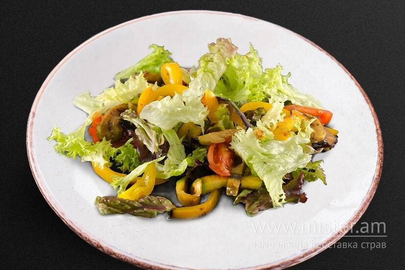 Баклажан, кабачок, печериці, перець Болгарський, бальзамічна заправка, мікс салату, олія часникова, помідори чері.