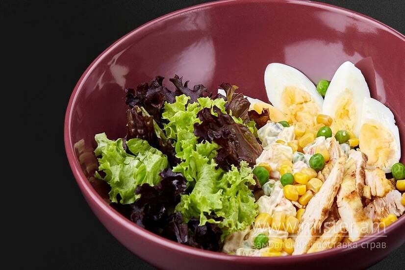 Морква, картопля, огірок маринований, куряче філе, горошок, кукурудза, мікс салату, яйце куряче.