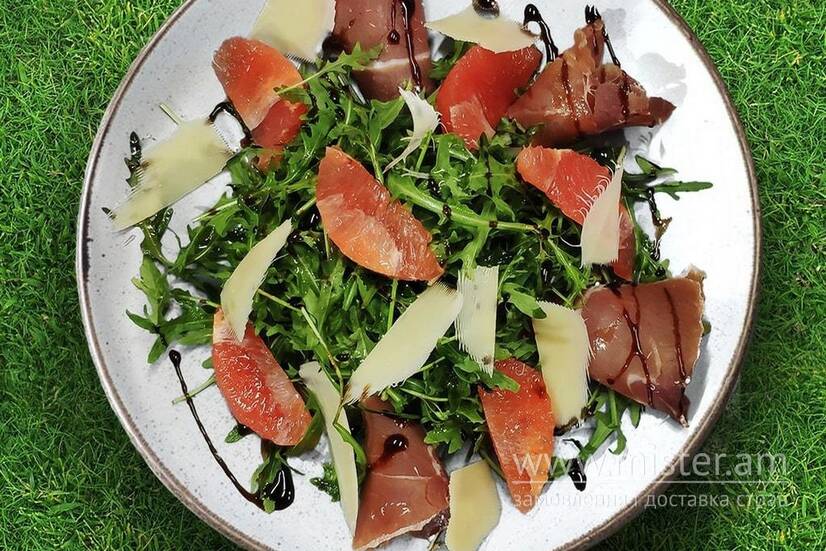 Хамон, рукола, грейпфрут, сир пармезан, олія оливкова, крем бальзамік.