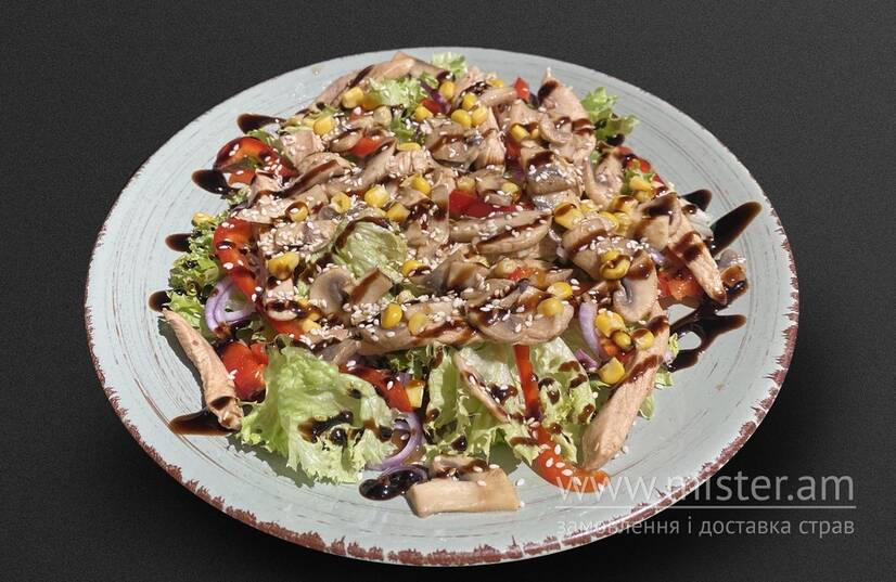 Мікс салату, куряче філе, перець болгарський, печериці, цибуля червона, консервована кукурудза, соус соєвий, олія часникова, крем бальзамік, кунжут.
