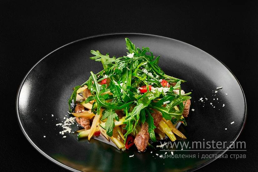 Яловича вирізка, свіжий і маринований огірок, сир пармезан, селера, соус чилі, рукола, чорний перець мелений.