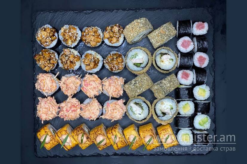 Рол з чедером та лососем, макі авокадо, макі тунець, вулкан сурімі, вулкан вугор та курка, цезар темпура.