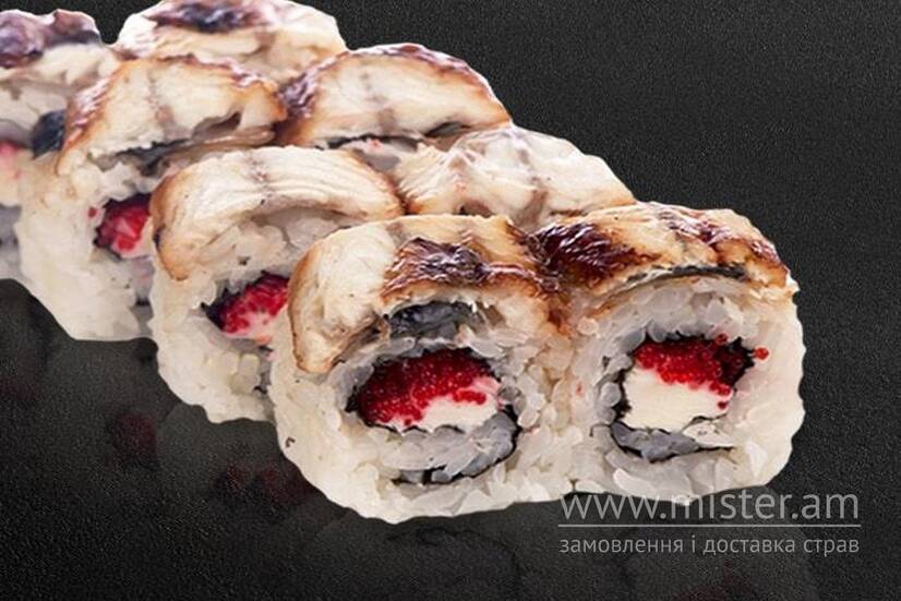 Вугор, рис, норі, унагі, кунжут, вершковий сир, огірок, ікра тобіко.