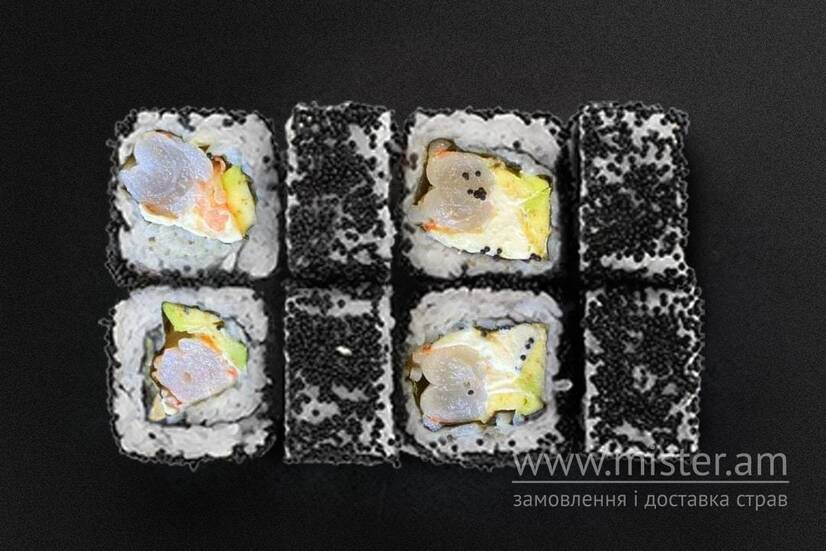 Креветка, рис, норі, авокадо, ікра тобіко, унагі соус.
