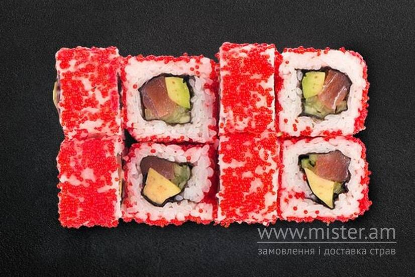 Лосось, рис, норі, авокадо, ікра тобіко.