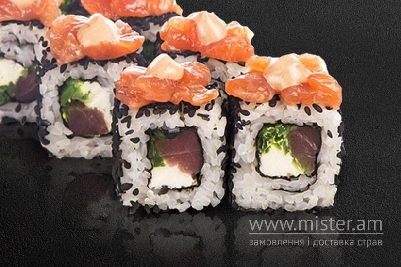 Тунець, вершковий сир, чука, чорний кунжут, лосось, соус спайсі, японський майонез.