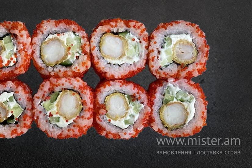 Креветка, сир вершковий, огірок, рис, норі, темпура, тобіка червона.