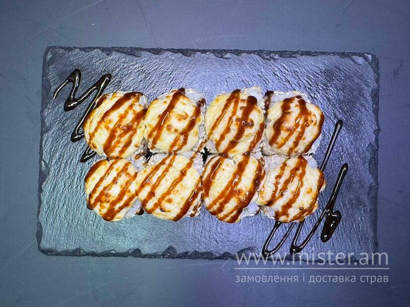 Куряче філе, рис, сир вершковий, огірок, норі, Лола роса, сир пармезан, соус цезар, сирна шапка, унагі