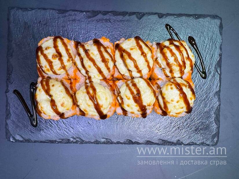 Лосось, рис, норі, авокадо, ікра тобіко, сир вершковий, сирна шапка, унагі