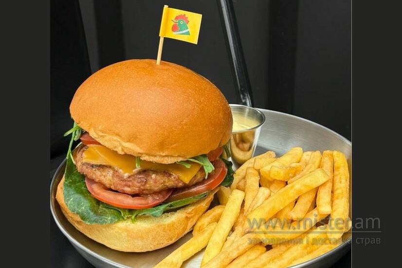 Бургер з курячою котлетою, витриманим сиром чеддер, томатами, маринованими огірками, руколою, шпинатом, соусами песто