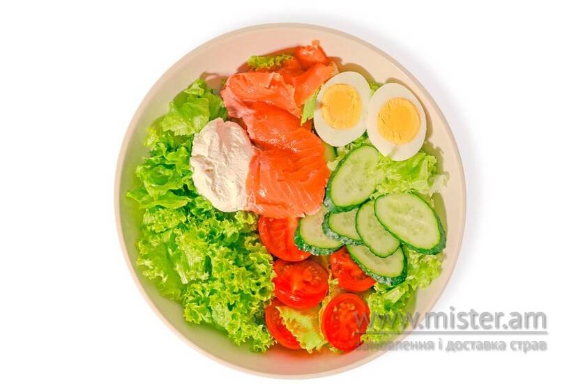 Листя салату, томати, огірки, лосось, крем сир, яйце, соус лимонно-медовий