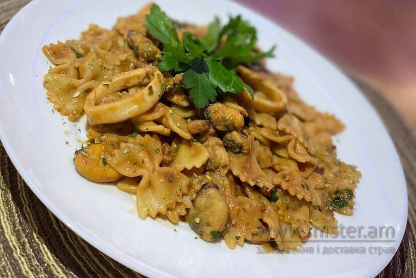 Паста Фарфалє, кальмар, мідії, креветки, вершково-томатний соус