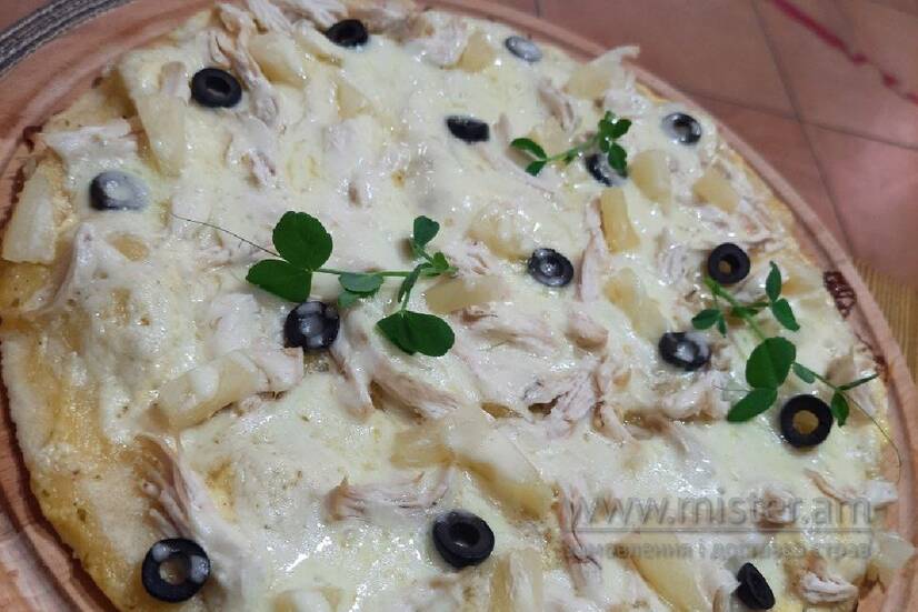 Моцарела, пармезан, грудка куряча, ананас, маслини.