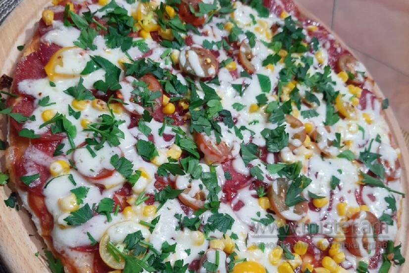 Салямі, моцарела, пармезан, кукурудза, помідор чері.
