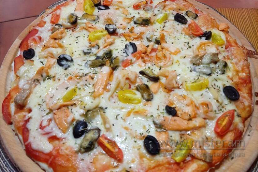 Моцарела, морський мікс, лосось, помідори чері, маслини.