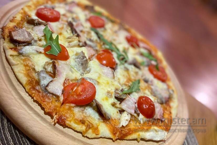 Язик,грудинка,куряче філе,печериці,томат,моцарела