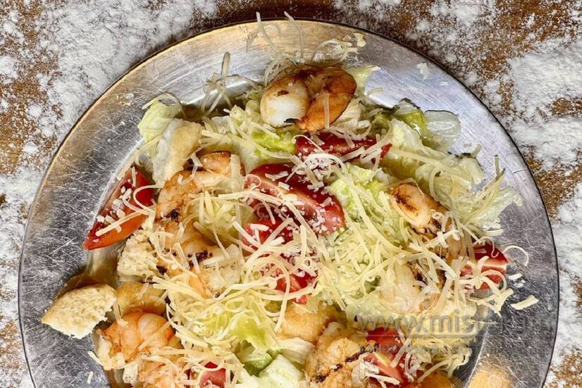 Салат айсберг,креветка,помідор чері,сухарі,сир пармезан,яйце перепелине,соус цезар