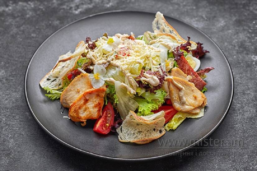 Салат айсберг,перепелине яйце,смажена курка,сухарі,сир пармезан,помідор чері,соус цезар