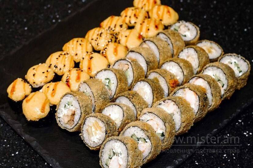 Теплий рол з креветкою, теплий рол з куркою, темпураз лососем, темпура з крабом, темпура з куркою