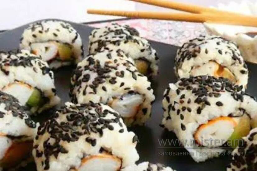 Креветка,рис,норі,сир філадельфія,авокадо,огірок,ікра тобіко,кунжут