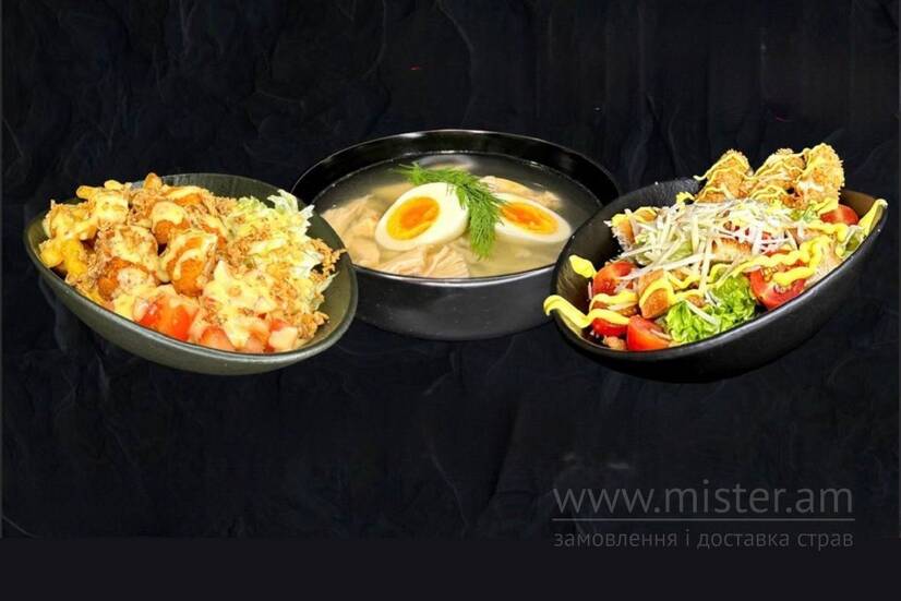Склад : Курячий бульйон , боул Чикен , салат цезарь .