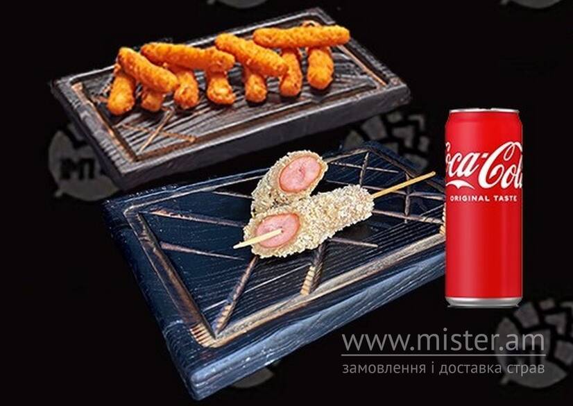 Сирні палички (165гр), корн дог (60гр), напій Coca cola 330ml.