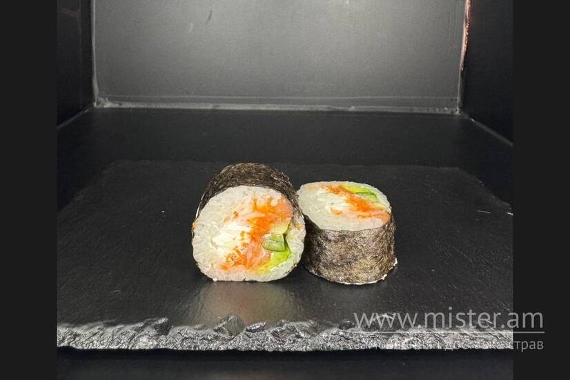 Лосось , креветка, лист салату , ікрака масаго , крем сир, авокадо , огірок , норі , рис , соус унагі , кунжут.