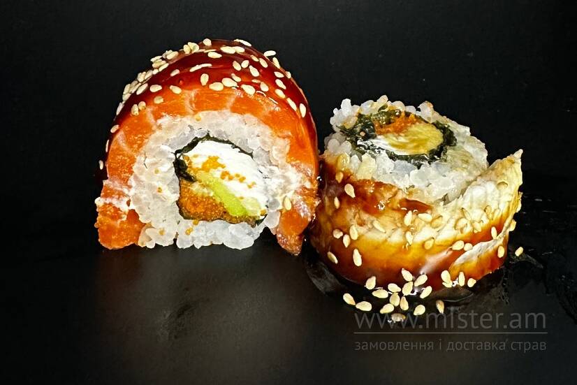 Лосось, вугор, укра масаго, крем-сир, авокадо, кунжут, рис, норі, соус унагі