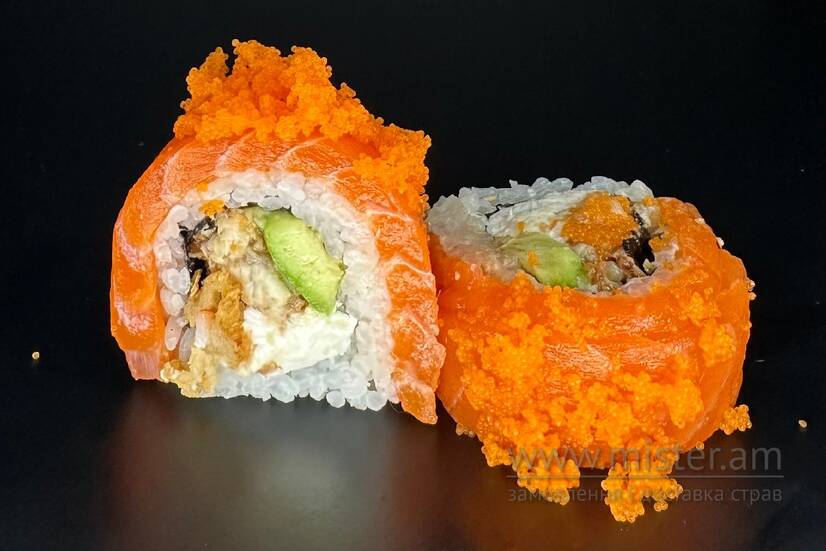 Лосось, креветкапанко, вугор, ікра масаго, крем-сир, авокадо, рис, норі