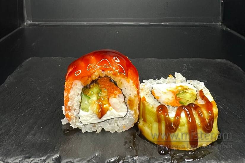 Лосось, креветка, ікра масаго, авокадо, крем-сир, огірок, рис, норі, соус унагі.
