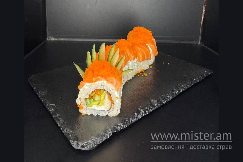 Креветка ,лосось, тобіко , крем сир , авокадо, огірок,рис , норі