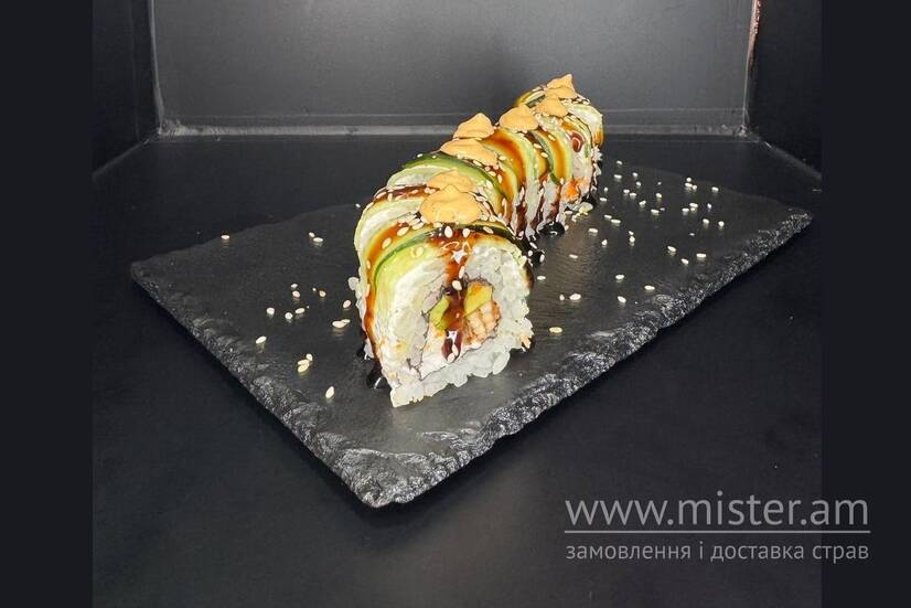 Вугор , тобіко , крем сир , авокадо, огірок, кунжут , соус спайсі , соус унагі , рис , норі