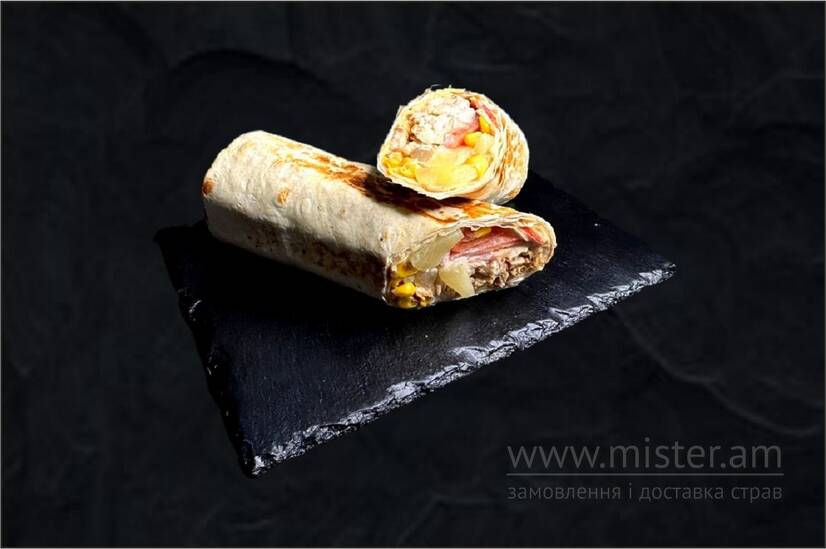 Лаваш, курка, ананас, кукурудза, помідор, моцарела, сир, цибуляфрі, соус білий
