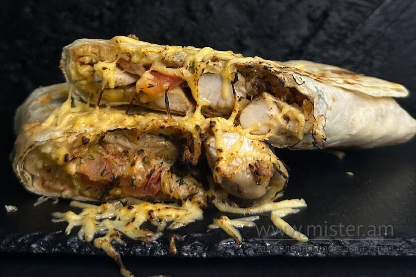 Лаваш, курка, помідор, картопля фрі, айсберг, огірок маринований, цибуля червона, цибуля фрі, соус білий, червоний