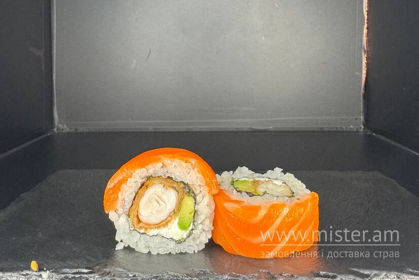 Рис, лосось, креветка, темпура, норі, тобіко, авокадо.