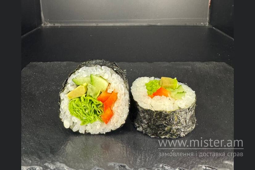 рис, норі, огірок, авокадо, лисття салату, перець солодкий