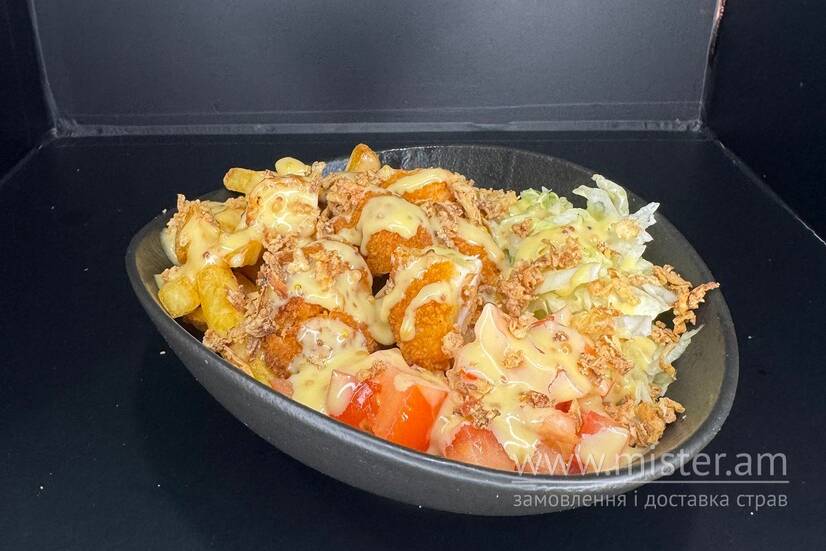 Картопля фрі, нагетси, лисття салату, помідор, цибуля фрі.